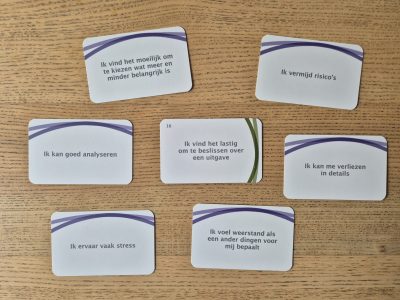 Money Matters is ontwikkeld door Vanuit Autisme Bekeken (VAB) en samen met mensen met autisme ontwikkeld. Via moneymatters.nu kun je de kaarten downloaden, zelf printen en uitknippen. De kaarten gaan over geldgedrag en persoonlijke kenmerken. Je kiest welk geldgedrag je bij jezelf herkent en wat je beter van jezelf wilt begrijpen. Bij die kaartjes leg je jouw persoonlijke kenmerken die met het geldgedrag kunnen samenhangen. Door het zo voor je neer te leggen, kun je meer inzicht krijgen waarom jouw geldgedrag is zoals het is. Het helpt je ook om te bepalen of je dit gedrag wilt of kunt veranderen.